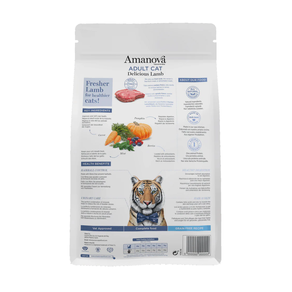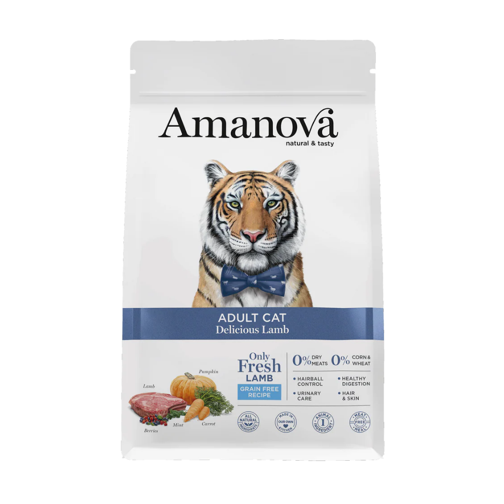Amanova Adult Cat Delicious Lamb es un pienso sin cereales para gatos adultos a partir de los 12 meses de edad. Preparado únicamente con cordero fresco como única fuente animal, aporta altos niveles de proteína y grasas dietéticas, además de un delicioso sabor para satisfacer los paladares más exigentes.