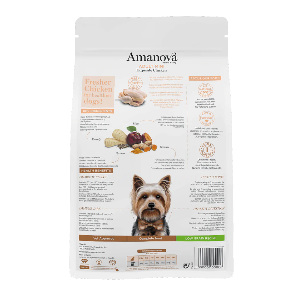 Amanova Adult Mini es una receta exclusiva de alta palatabilidad con croquetas de estructura especial para mandíbulas pequeñas que no contiene harinas de carne ni carnes deshidratadas. La elección perfecta para perros pequeños o minis.