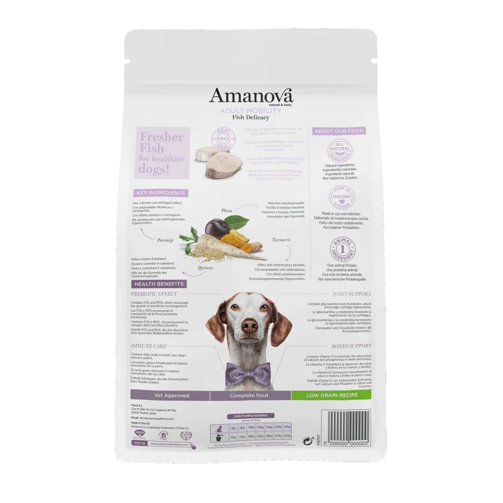 Pescado blanco preparado en fresco 61% (usamos 110 kg de pescado blanco preparado en fresco para producir 100 kg de nuestro producto),guisantes verdes enteros, arroz integral, cebada integral, proteína de patata, avena integral, hidrolizado de pescado, levaduras (Saccharomyces cerevisiae),minerales, semillas de lino (fuente natural de ácidos grasos ω3), fibra de manzana, aceite de pescado (protegido con tocoferoles naturales), glucosamina 1400mg/kg, calabaza deshidratada, brócoli deshidratado, arándanos rojos, spirulina, alga kelp, jengibre, krill del antártico, zanahoria blanca 1000 mg/kg, ciruelas deshidratadas 1000 mg/kg, quínoa 1000 mg/kg, metilsulfonilmetano (msm)1000 mg/kg, condroitina 1000 mg/kg, achicoria (fuente de FOS) 1000 mg/kg, kale deshidratada, cúrcuma 1000 mg/kg, pared celular hidrolizada de levaduras(fuente de MOS) 1000 mg/kg, romero 250 mg/kg, yucca schidigera.