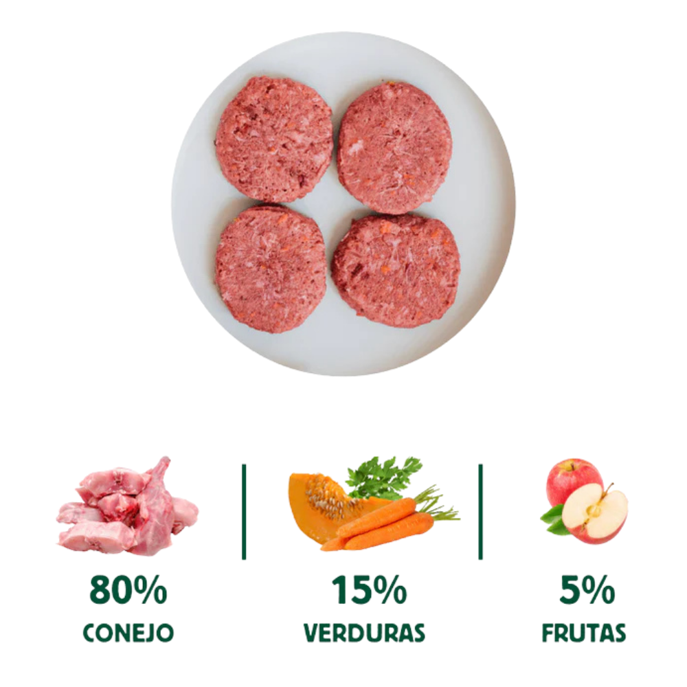 Conejo 80% (Pieza entera de conejo – incluye vísceras), Verduras y frutas 20% (zanahoria, calabaza, calabacín, remolacha, pimiento, manzana), Ascophyllum nodosum, alfalfa, romero, perejil, semillas de chía, espirulina, mejillón de labio verde.