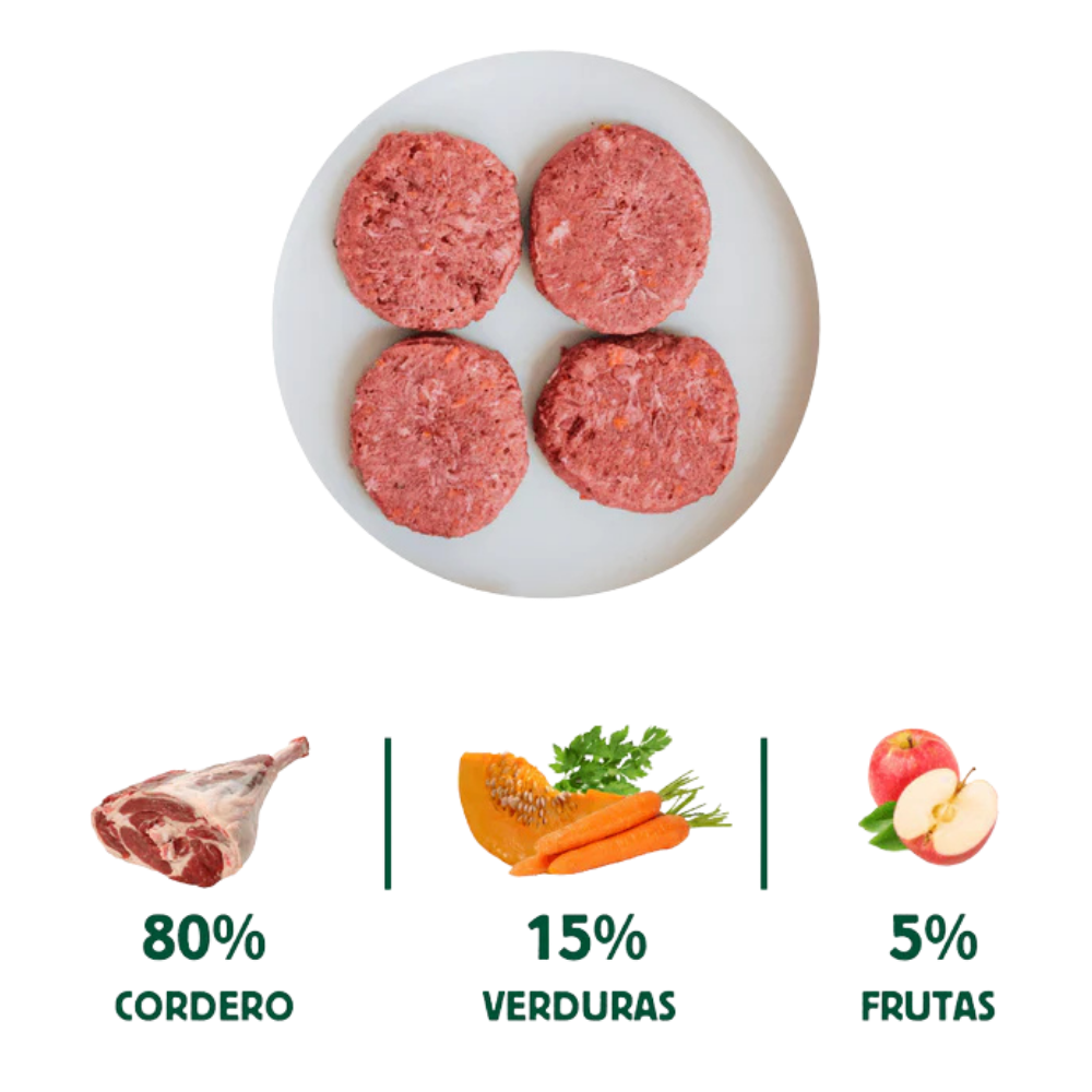 Cordero 80% (Hueso carnoso: falda y costillas. Carne de músculo: corazón y pulmón. Vísceras: hígado), Verduras y frutas 20% (zanahoria, calabaza, calabacín, remolacha, pimiento, manzana), Ascophyllum nodosum, alfalfa, romero, perejil, semillas de chía, espirulina, semillas de cáñamo, espirulina, mejillón de labio verde.