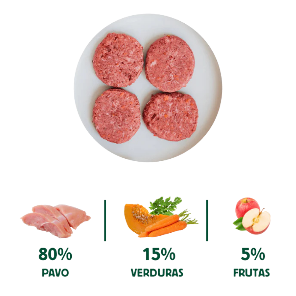 Pavo 80% (Hueso carnoso: carcasa, cuello. Carne de músculo: pechuga, corazón. Vísceras: hígado), Verduras y frutas 20% (zanahoria, calabaza, calabacín, remolacha, pimiento, manzana), Ascophyllum nodosum, alfalfa, romero, perejil, semillas de chía, espirulina, mejillón de labio verde.