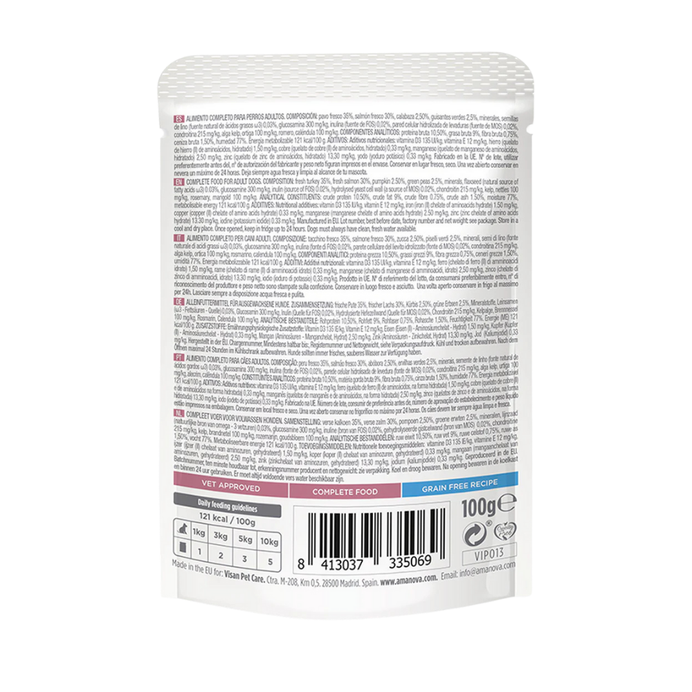 Pavo fresco 35%, salmón fresco 30%, calabaza 2,50%, guisantes verdes 2,5%, minerales, semillas de lino (fuente natural de ácidos grasos ω3) 0,03%, glucosamina 300 mg/kg, inulina (fuente de FOS) 0,02%, pared celular hidrolizada de levaduras (fuente de MOS) 0,02%, condroitina 215 mg/kg, alga kelp, ortiga 100 mg/kg, romero, caléndula 100 mg/kg.