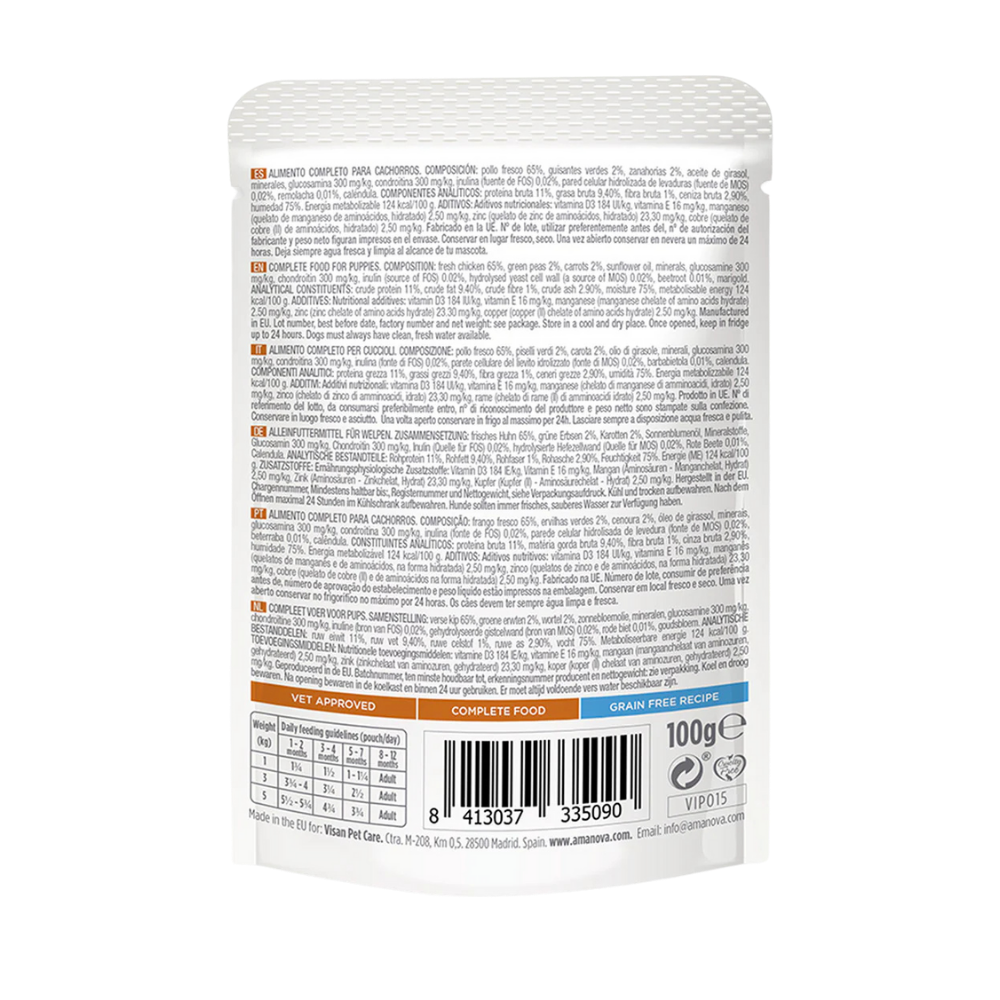 Pollo fresco 65%, guisantes verdes 2%, zanahorias 2%, aceite de girasol, minerales, glucosamina 300 mg/kg, condroitina 300 mg/kg, inulina (fuente de FOS) 0,02%, pared celular hidrolizada de levaduras (fuente de MOS) 0,02%,remolacha 0,01%, caléndula.